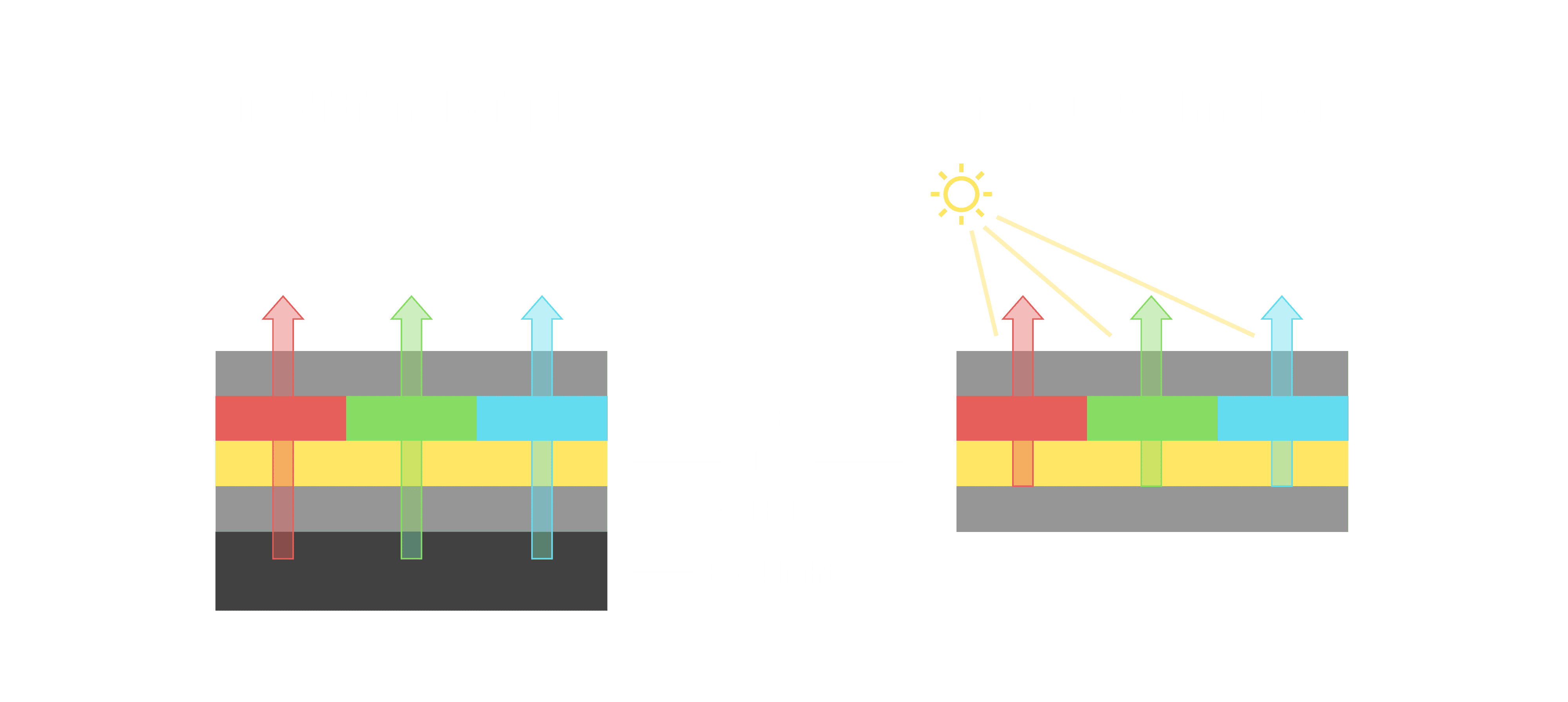 与传统需搭配背光单元的液晶显示相比,,反射式液晶技术不仅更省电、、更轻薄,,且即便在艳阳下仍能清晰显示。。此外,,,,少了背光单元,,,也大幅降低了 LED 蓝光伤害眼睛的疑虑。。。